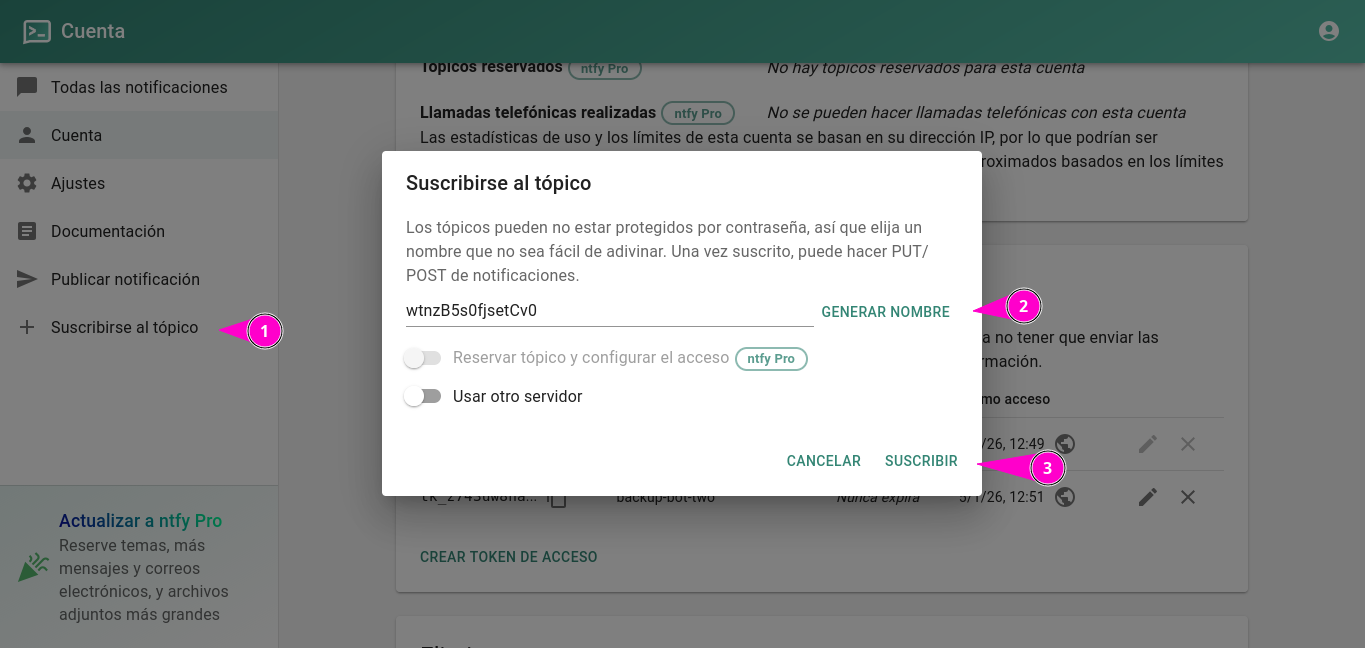Para poder recibir las notificaciones, primero hay que suscribirnos. Usamos generar nombre aleatorio para que no sean fácilmente adivinables (ni tengamos que pensar un nombre) y copiamos ese nombre también.