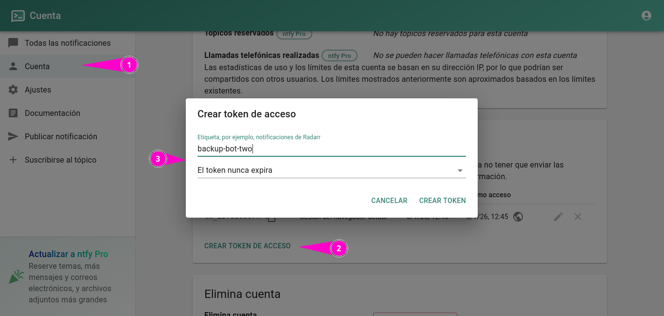 Ahora con token y nombre aleatorio, podemos configurar `backup-bot-two` para enviar notificaciones.