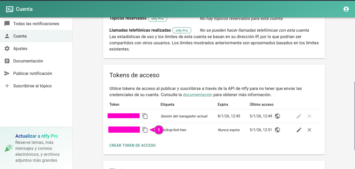 La primera es la notificación de comienzo, luego vienen la de éxito y la de error. Tenemos que generar los vínculos de ntfy para que backup-bot-two genere estas notificaciones.